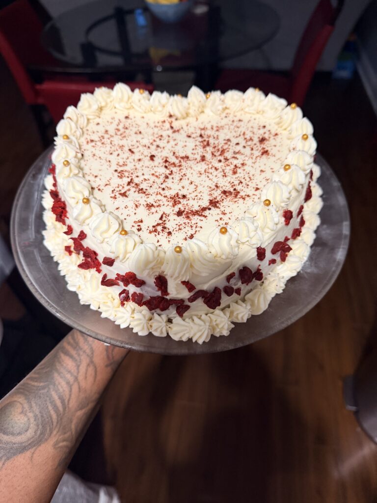 Our Red Velvet Bundt Cake is a moist, velvety cocoa-infused cake with a rich red crumb and a smooth, tender texture. Finished with a generous layer of creamy cream cheese frosting, this classic dessert delivers the perfect balance of subtle chocolate flavor and tangy sweetness. Elegant yet indulgent, it’s a timeless favorite for celebrations, gatherings, or simply treating yourself.