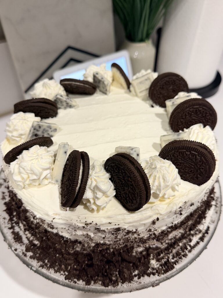 Our Oreo Cookies & Cream Cake features moist vanilla cake layered with smooth cookies-and-cream cheese frosting, made with crushed Oreo® cookies folded into every bite. Finished with a creamy swirl of cream cheese frosting and topped with Oreo cookie pieces, this cake delivers the perfect balance of rich, sweet, and nostalgic flavor. A classic crowd-pleaser, beautifully crafted for birthdays, celebrations, or any occasion worth indulging.